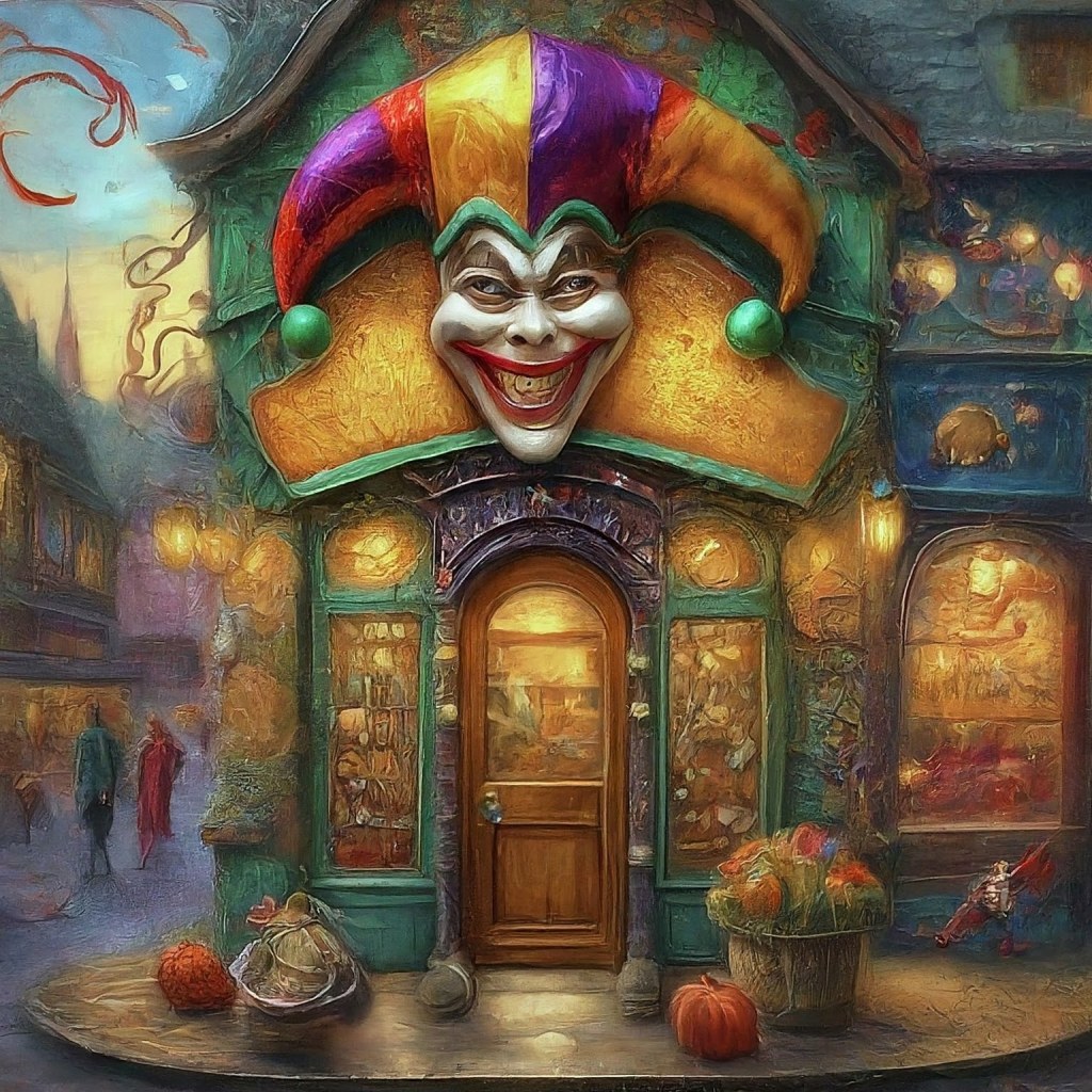 As the players follow the trail of magical chaos, they stumble upon a whimsical building in the heart of Sliberberg, topped with a jester cap for a roof. A vibrant sign reads “Joker’s Choice – Where Mirth Meets Magic.” Upon entering, the air is filled with the tinkling sound of a bubble pipe, and the space is crammed with shelves displaying an array of enchanted pranks and costumes.