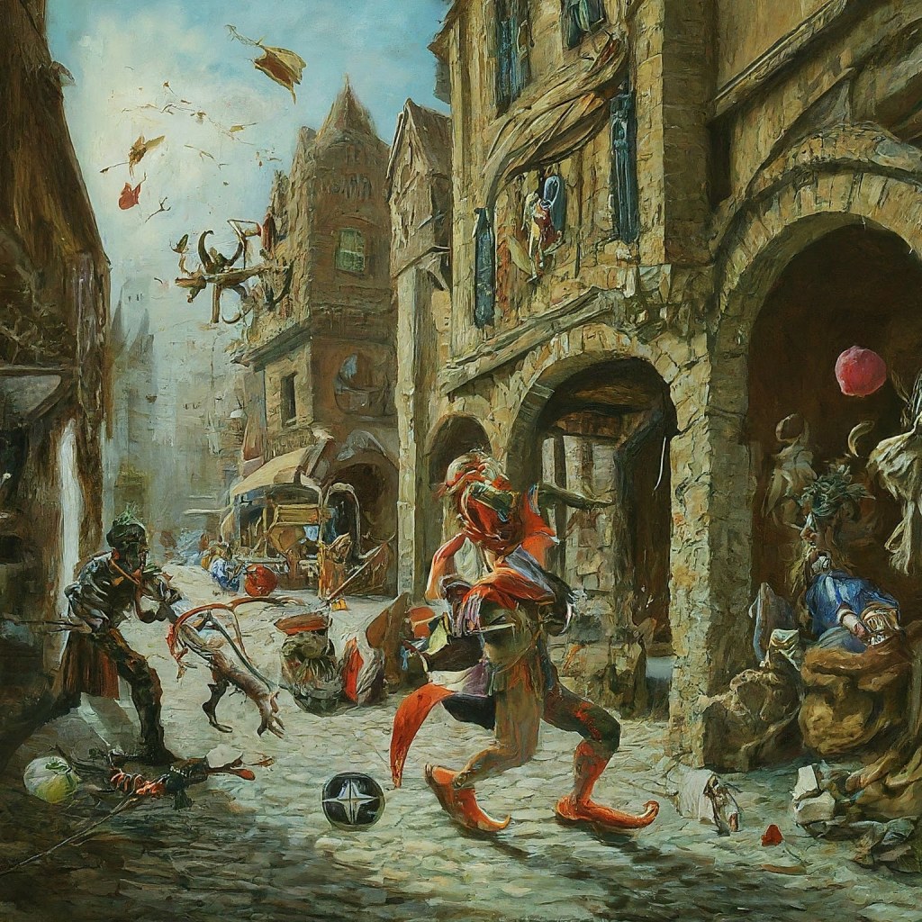 Chase Sequence: The players now find themselves in pursuit of the bejeweled jester, Clóirtheach, through the winding streets of the market ward. However, the mischievous Fey Sovereign has some tricks up his sleeve. During the chase, he conjures obstacles inspired by traditional slapstick comedy: