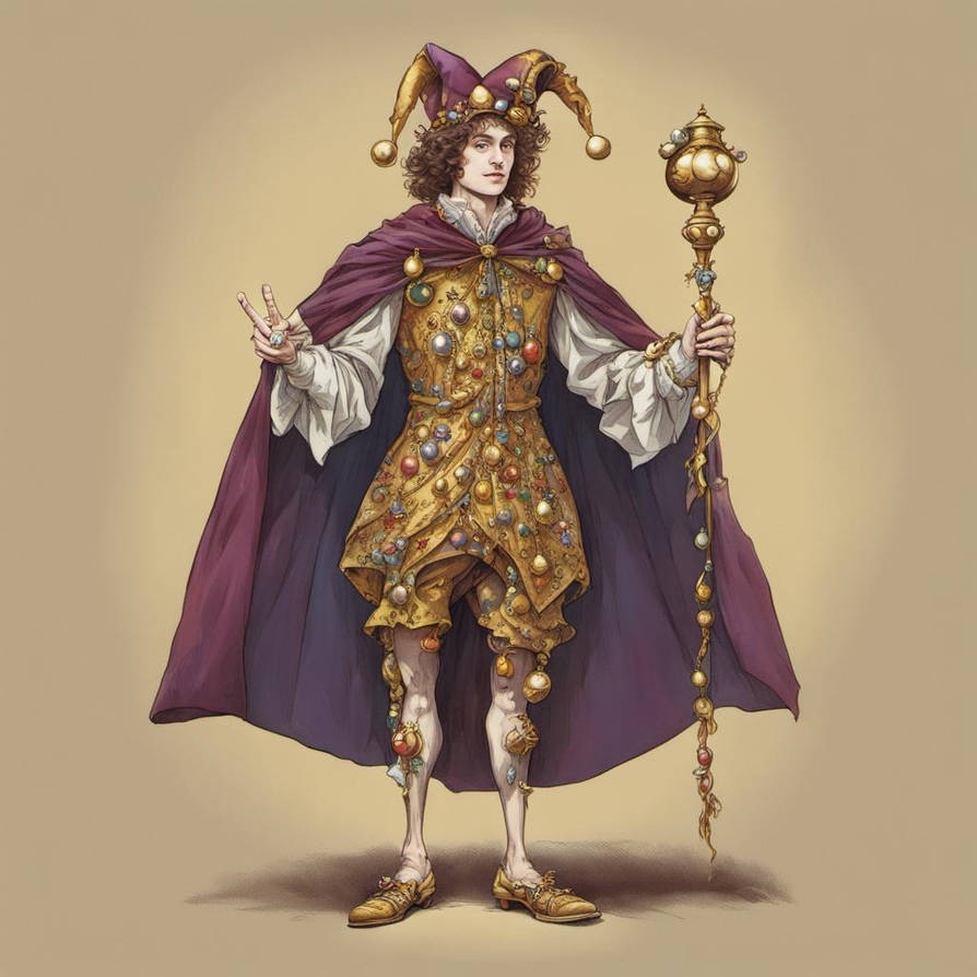 The door swings open with a jingle, and before you stands a goblin dressed in a riotous jester’s outfit, teetering on three-foot-tall stilts. With a flurry of exaggerated gestures, he pulls a bubble pipe from his pocket and begins blowing bubbles as he excitedly addresses you.