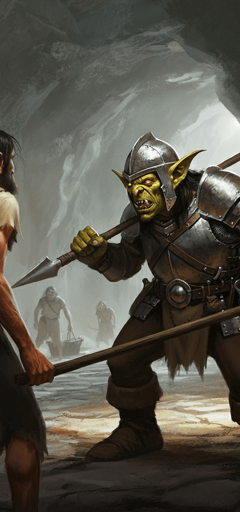 With sharp blows of the spears, the guards drive you and the other prisoners through the dark and gloomy tunnel while the notorious goblin corporal Cael O’Leary leads the way. The guards lead you past a fork in the tunnel with signs with words like “Danger,” “Stay out,” and “Cave in” written in all red all caps letters. A minute later, you arrive at a large cavern with a roof held up by wooden beams. “Alright, worms, get to work,” shouts Corporal Cael, “Don’t think about slacking off, or you’ll get beaten.” Cael grins at the thought of delivering a beating, and the prisoners disperse to start hacking at the rocks.