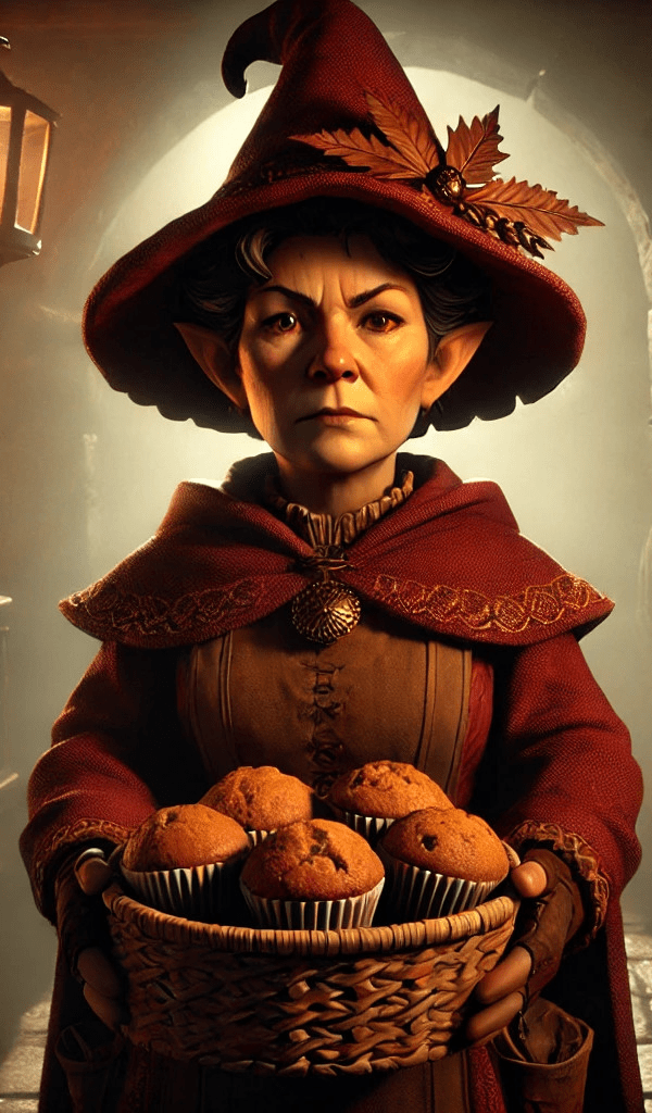 The door swings open, and a short figure is outlined in the lantern light beyond. “Alright, you a band of layabouts, rise and shine,” she says in a cockney accent. She steps forth, revealing a middle-aged gnome woman. Her face is brownish with angular features and the attitude of a schoolmistress. She wears a well-made and almost stereotypical good witches’ outfit of red cloth with gold accents. She holds in her hands a basket of steaming hot muffins.