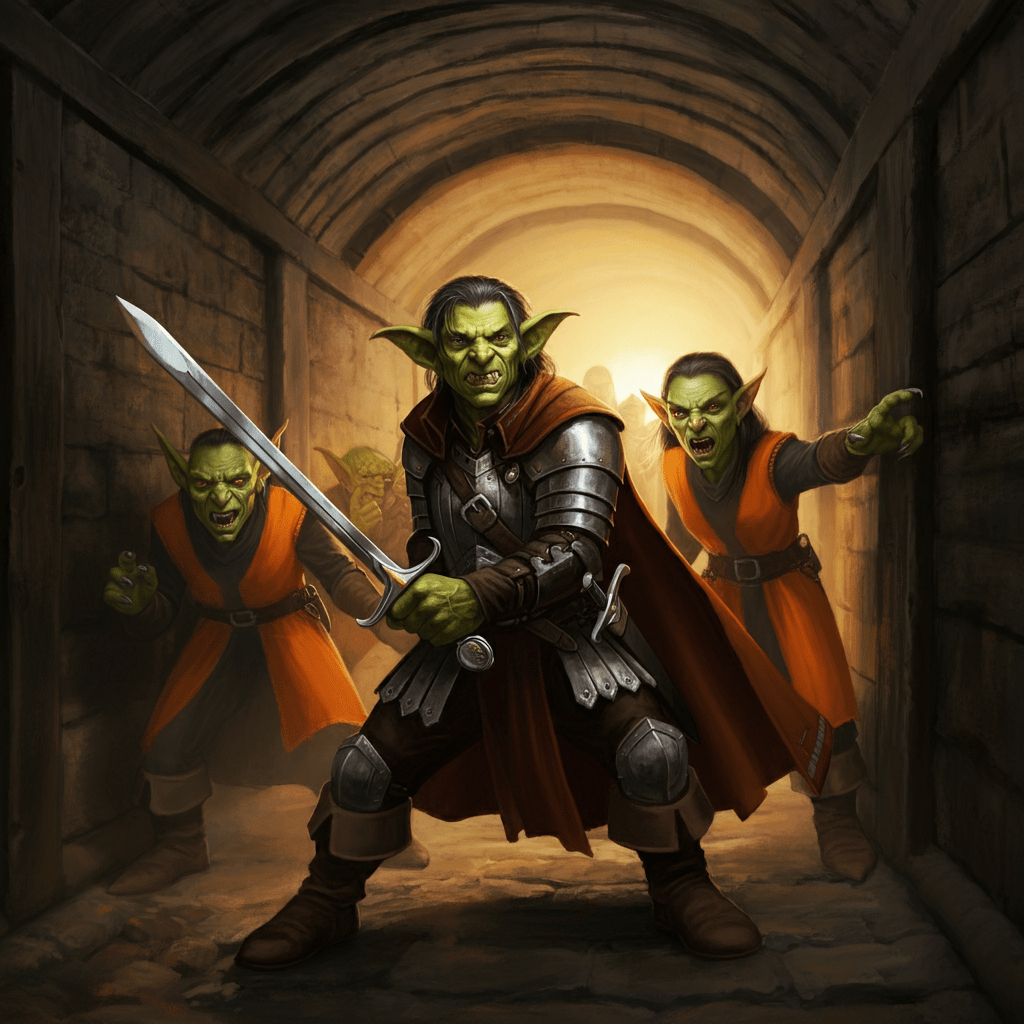 Your feet pound the tunnel’s stone as the Ironhold gate recedes into the distance. You are almost at the tunnel’s end when a party of soldiers steps into it. There is a moment of confusion, which ends when a hobgoblin officer in fancy clothes shouts, “What are you waiting for? They are obviously escaped prisoners.” The soldiers form up to block you.