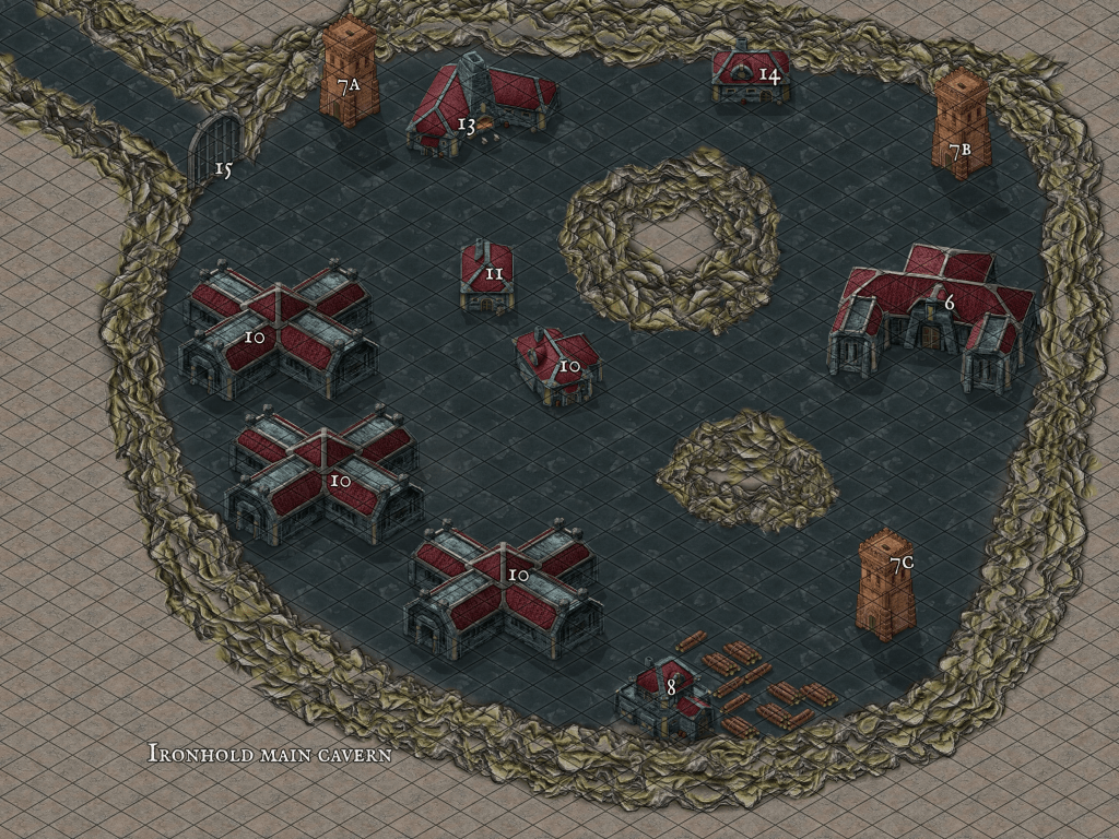 Now that the players are equipped, they must go through the mine and camp to escape Ironhold. Only one tunnel leads from the cavern complex from Ironhold to Underberg and the rest of the city. Unfortunately, they must sneak through the heavily guarded camp to get to the tunnel. Their benefactor’s letter makes it clear that they cannot dawdle unless they want to escape under the thunderous ringing of alarm bells and a small army on their heels.