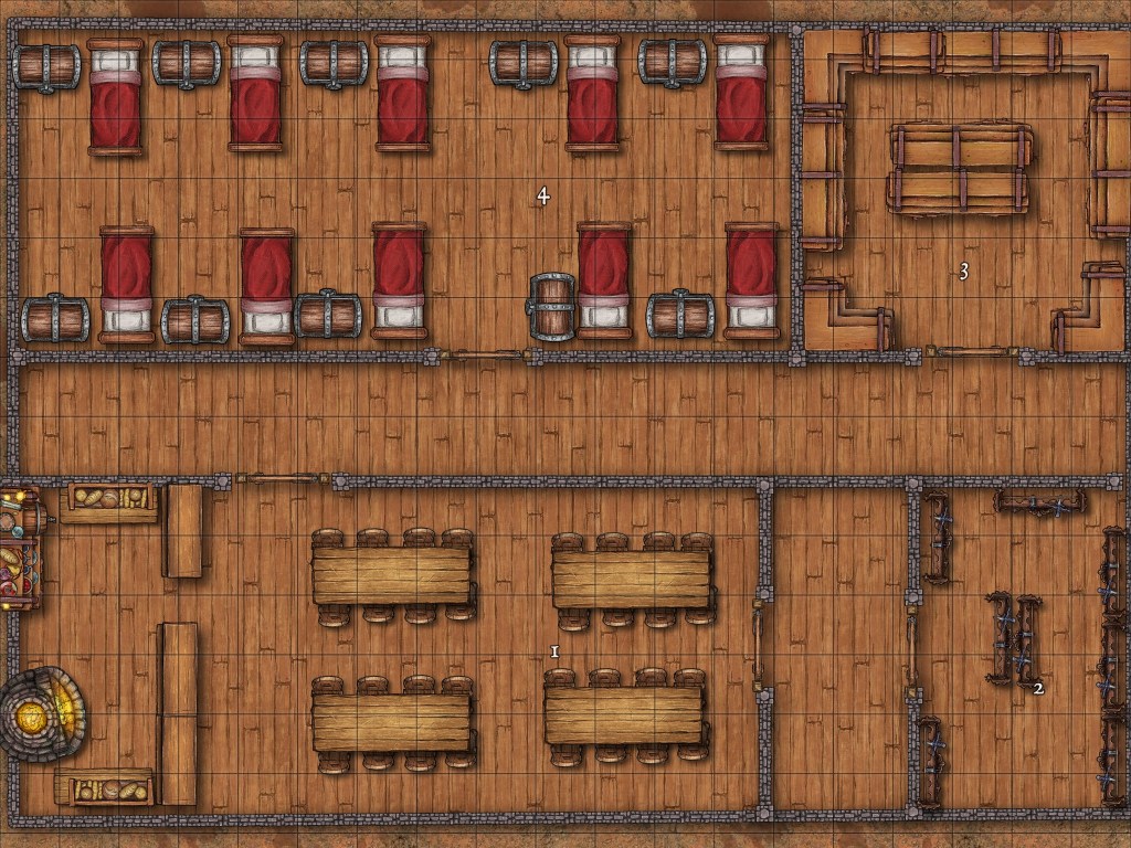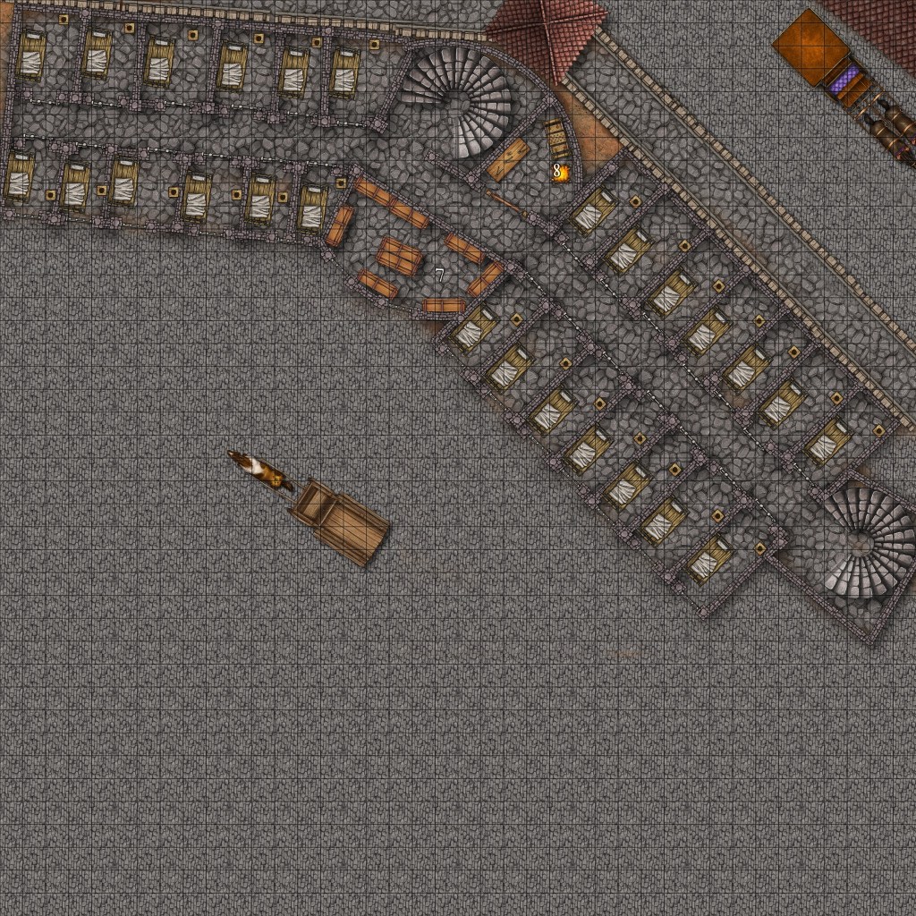 The mess hall is filled with the sound of spoons on tin plates and chit-chat of soldiers as you enter. The smell of stew is in the air. Men sit along long tables on benches. However, when they spot you, the noise suddenly stops, and they start to reach for spears and bows.