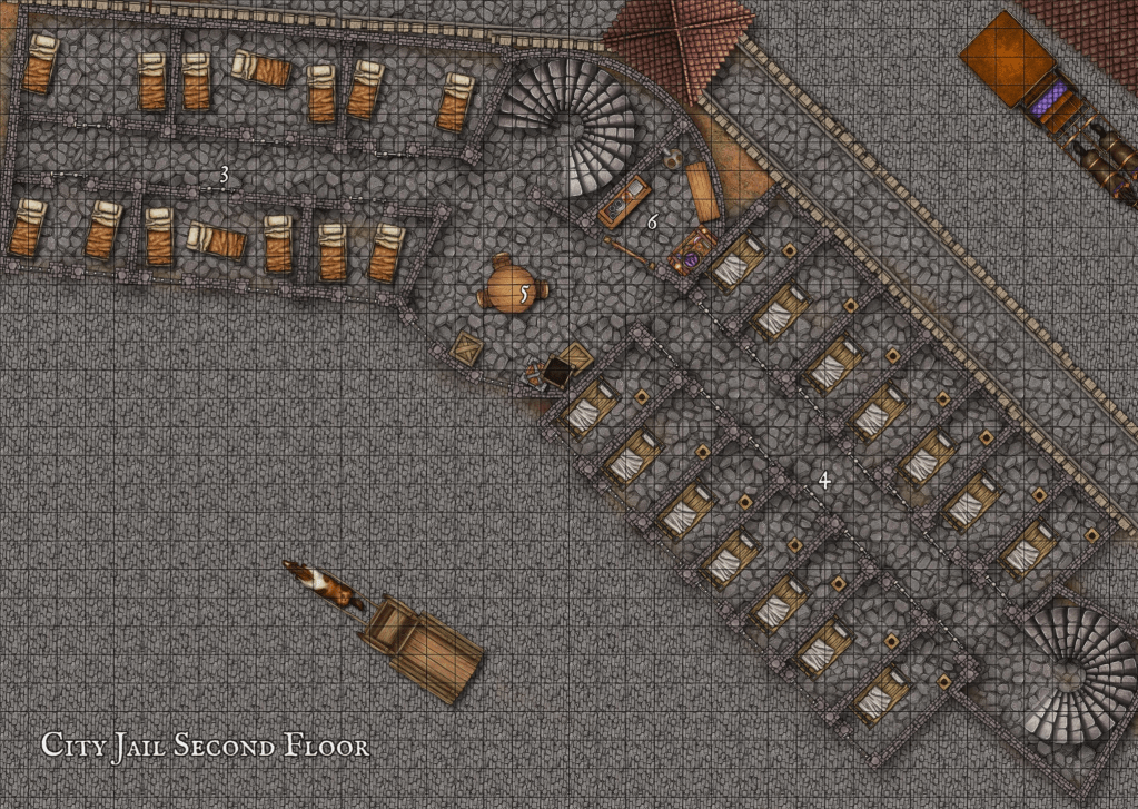 | 20 | The city jail has three cell blocks, one for low-level offenders, one for hardened criminals, and a solitary confinement wing. |