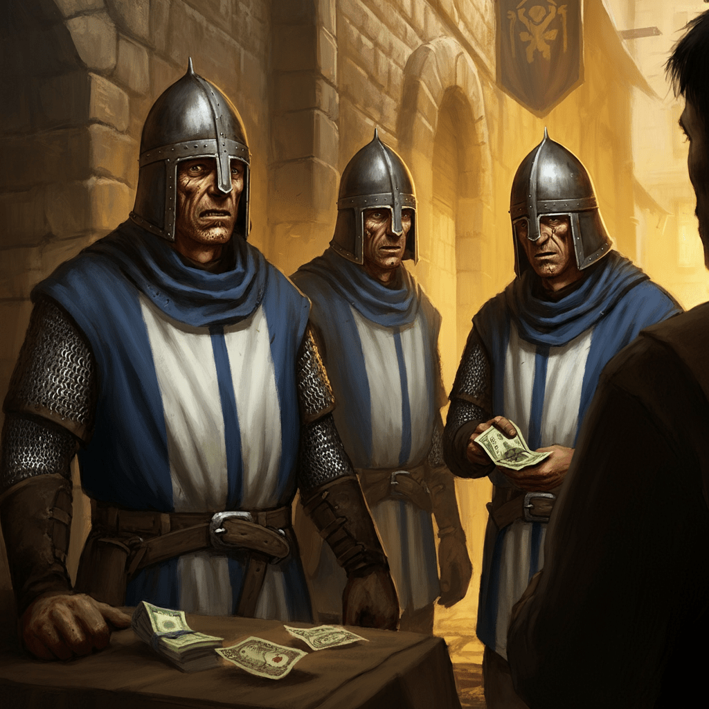 The players witness a person falsely accuse another person of “Crimes against the regime” in front of a group of watchmen. Because of the outlandishness of the accusation, the players can tell that the accusation is false from the reaction of the onlookers and the accused without an insight check. The players can choose to intervene in the scene using persuasion or deception check DC 15 at the risk of drawing attention to themselves.