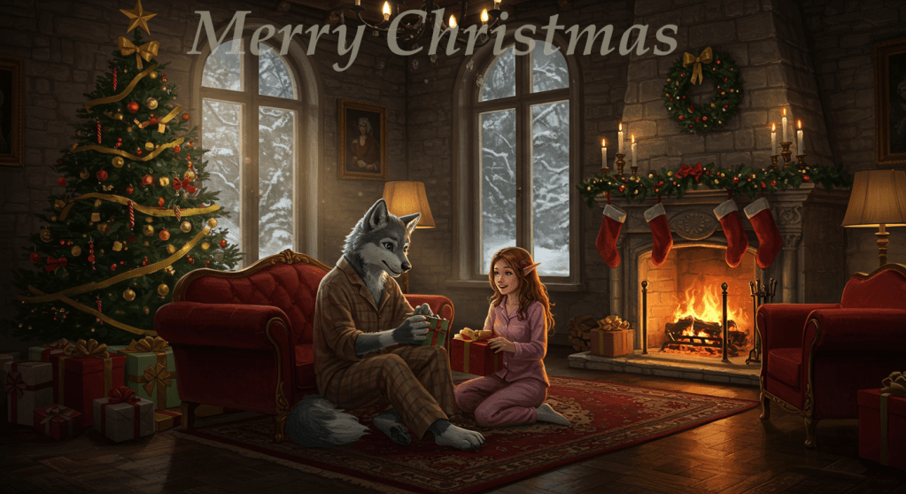 In thanks for being a wonderful audience please except this cozy image of a Fredrick and Aoibheann opening gifts on Yuletide morning. Please enjoy your gift.
