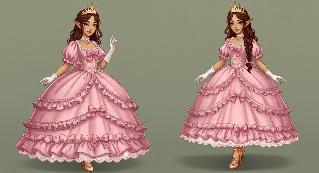 Honestly, I think this Princess Peach-esque fairytale princess design suits Aoibheann well. With almost every other lady of noble birth in the Feengrenze being a manipulative bitch who revels in the suffering of others and the humiliation of their enemies, there has to be at least one example of the classic Fairytale Princess around to ensure we do not slip into something akin to grimdark.