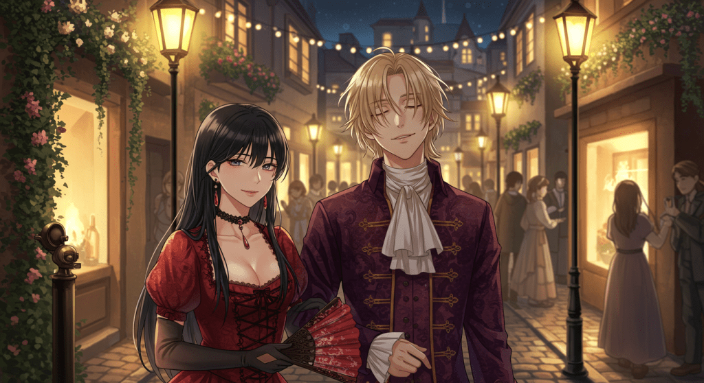 It only takes a few minutes of searching before you see them. A young lady with raven black hair, olive skin, piercing green eyes, and a perfect face is leading a young man by the arm from an expensive restaurant onto the busy street. She wears an elegant red silk dress with ample lace and a scandalously plunging neckline that shows off her ample bosom. Every eye in the crowd is fixed upon her, and she playfully revels in the attention, giving her admirers sweet smiles, playful glances, and occasionally blown kisses disguised by her silk fan. The boy at her side is, in stark contrast, looks dazed, as though he is sleepwalking. His blood hair is slightly disheveled, his fine doublet is open at the color, and his face has a dreamy look.