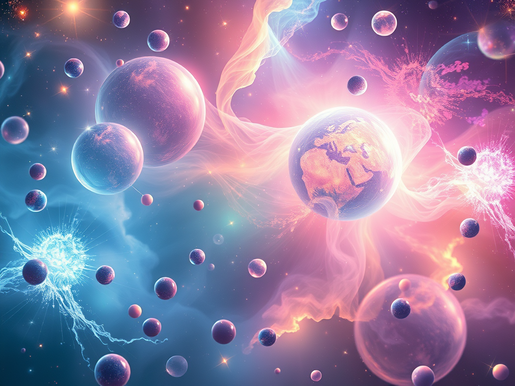 While this might seem as disorderly as a beaker of shaken soap bubbles, there is an order to Manyfold. Each of the bubbles in the sea of aether is acted upon by six fundamental metaphysical forces: Negentropy, Entropy, Life, Decay, Belief, and Nihilism. These forces represent: Negentropy (the force of order and increasing complexity), Entropy (the force of disorder and dissolution), Life (the force of vitality and creation), Decay (the force of death and stagnation), Belief (the force of faith and shared conviction), and Nihilism (the force of nothingness and disbelief). The pull of these six forces, along with collisions with their neighbors, plus a possible undiscovered 7th force, keep each universe anchored in the same relative position to all the other universes. At the center, or as close as something infinite in size and scope can have a center, lies the mythical Zero Prime, the universe of absolute balance, where all six forces cancel each other out perfectly, a utopian realm, the perfect ideal of which all universes are pale imitations.