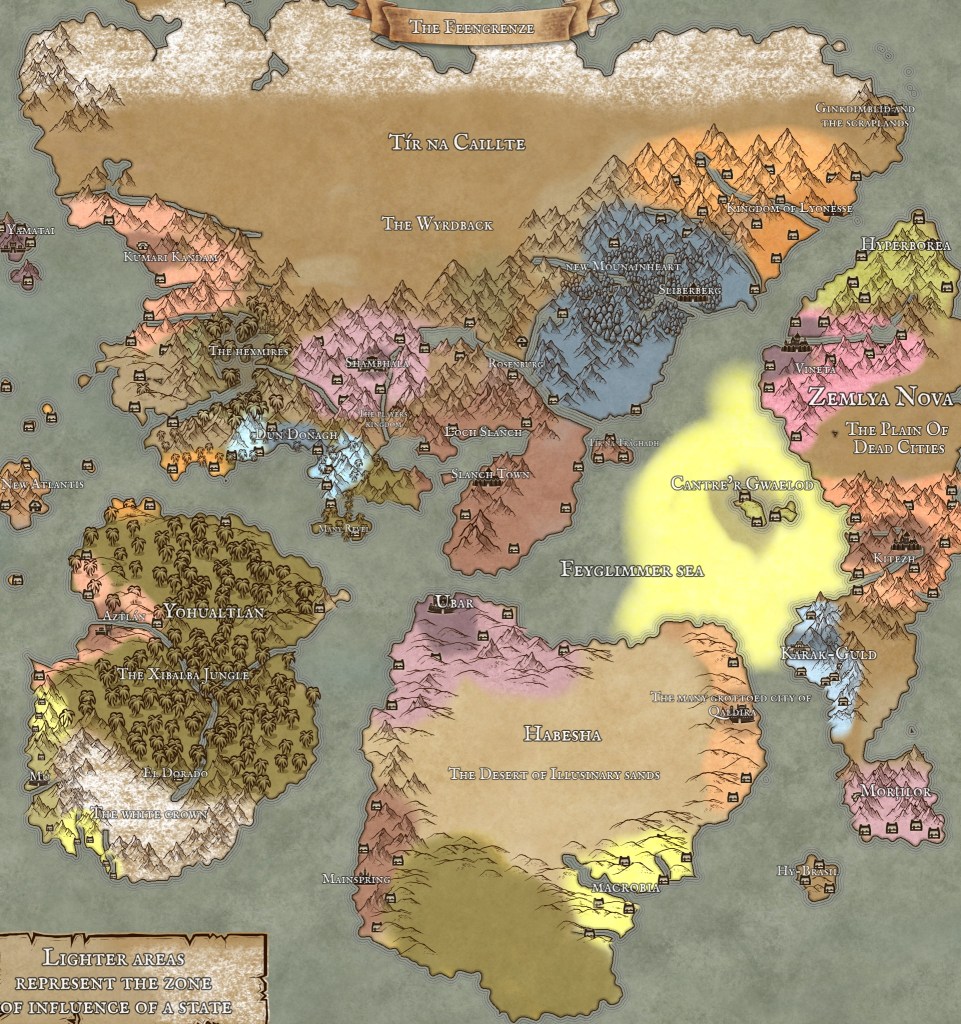 What is a game without its players? Just a bunch of pieces and a board, that’s what. The Feengrenze is home to 16 successor states, the so-called players of the great game. Each one is a political tragedy writ large, doomed to repeat the errors that doomed their parent civilization ad nauseam without any chance to reform or learn from past mistakes. A few are visibly floundering, a few are quickly heading for a fall, none of them are capable of escaping their doom loop on their own.