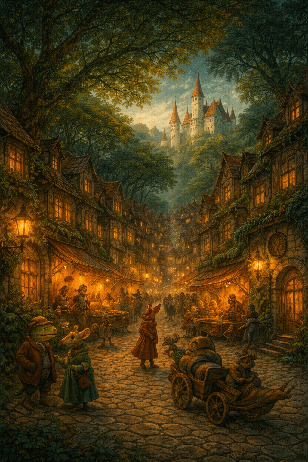 Above it all, at the end of a long road lined with palaces and lesser castles that curls around the forested slopes of the mountain, rises Castle Sliberberg, the seat of the von Mountainheart family — a crown of red-topped white spires reaching skyward. It stands as a promise cast in white stone: that here, dreams can come true.