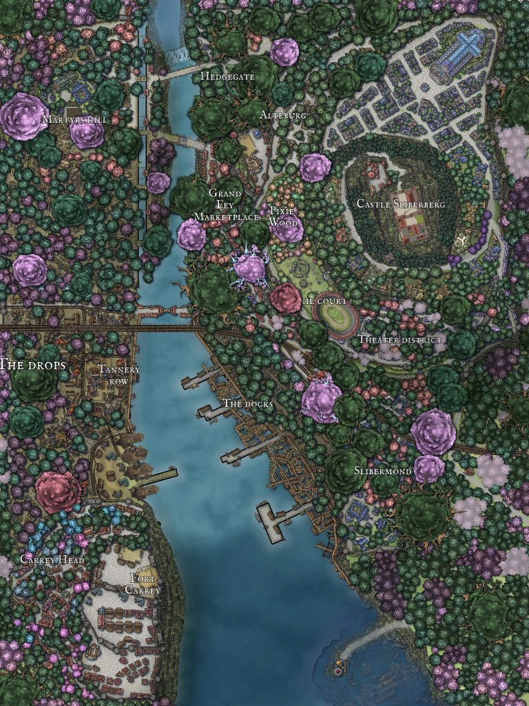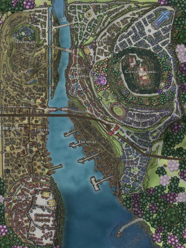 Trees are the defining element of Sliberberg’s skyline. The city is built beneath and around several dozen titanic ancient faerie trees nearly as old as the city itself, with thousands more filling the spaces between. Together, they form a continuous canopy that remains green year-round and creates the twilight world below. From a distance, it is difficult to tell where the fairy forests of the countryside end and the city begins.