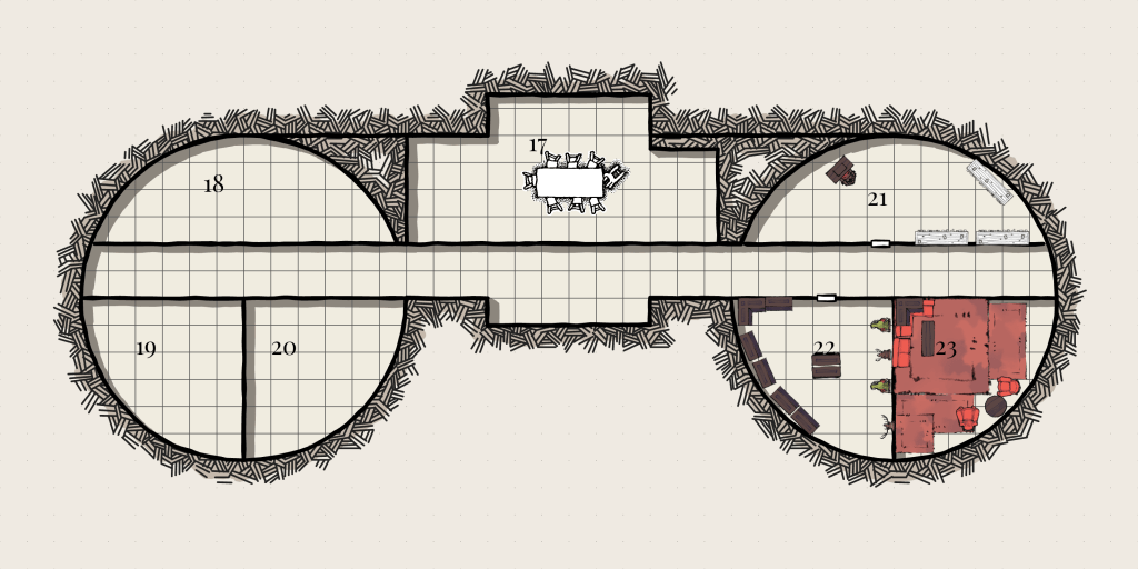 Description: As you step into the Great Hall, the atmosphere shifts from the grandeur of the throne room to a more utilitarian setting. Long feasting tables stretch across the hall, cluttered with empty plates and the remnants of recent meals. The vibrant banners that once adorned the walls have been replaced with makeshift sleeping quarters for the goblin army, creating a chaotic and cramped living space. During the day, the hall doubles as a mess hall for the hobgoblin soldiers, who now eye you with a mix of curiosity and hostility as they interrupt their meals to confront the intruders. Strangely enough there is a painting of what looks to be a baskets filled with bottles of yellow and green liquid hanging from the wall