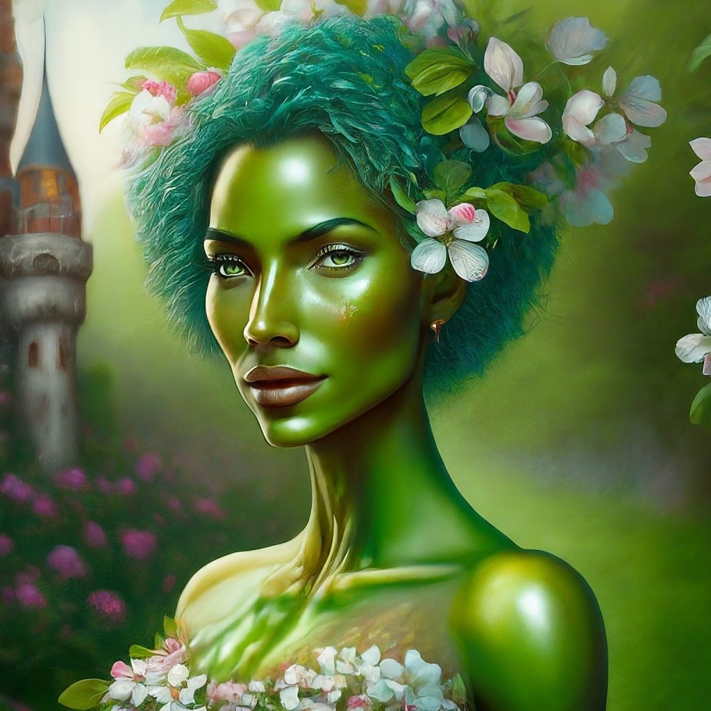 Lyria Blossomshade, the nurturing Dryad Royal Groundskeeper, calls the heart of Castle SLiberberg’s extensive gardens her home. Her essence is intertwined with the larger apple tree that stands as the centerpiece of the lush greenery. Lyria’s appearance is a celebration of nature’s beauty, with apple tree blossoms adorning her form, creating the illusion of a short pink dress. She always keeps at least one apple blossom delicately pinned in her “hair.”
