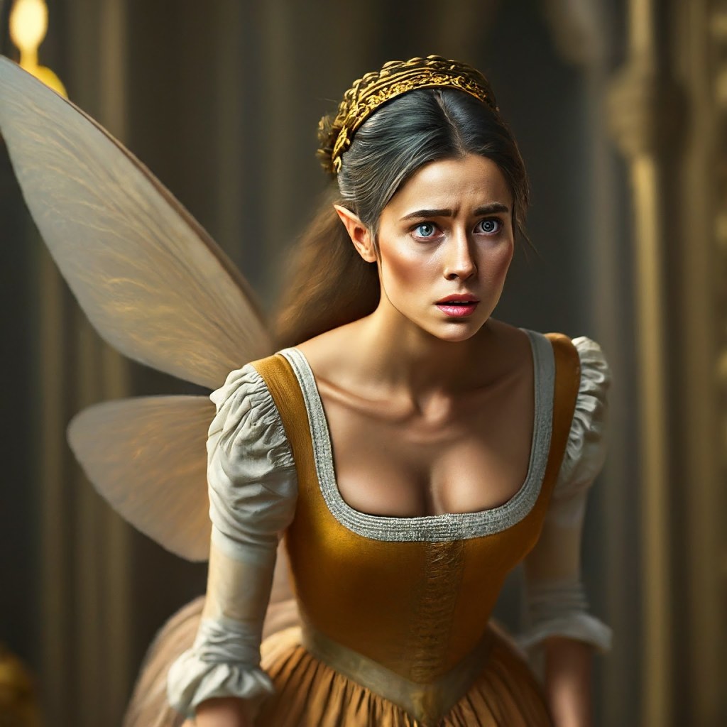 Lady Seraphina Dewwing, the delicate Fairy Chamberlain of Castle SLiberberg, flutters through the royal chambers with a perpetual air of nervousness. Her ethereal wings, translucent and delicate, carry her from one task to another as she maintains the royal quarters and guards the closely held secret of King Fredrick’s melancholy. Lady Seraphina is easily flustered, and if caught off guard, she tends to fly straight up into the ceiling, hitting her head, only to gently fall back down to the floor.