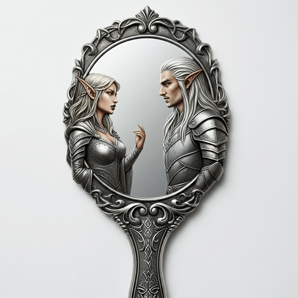 This ornate silver hand mirror has a frame shaped like an elven man and woman talking to each other. As an action, the wielder can speak the name of any other owner of a Mirror of Communion. If the mirror of the spoken individual is picked up by its intended recipient, the pair of mirrors starts to glow with ethereal light. The individuals can see each other in the mirror as if looking at their own reflection. The individuals can also hear each other as if they were in the same room. All mirrors of Communion are attuned to all other mirrors of its type.
